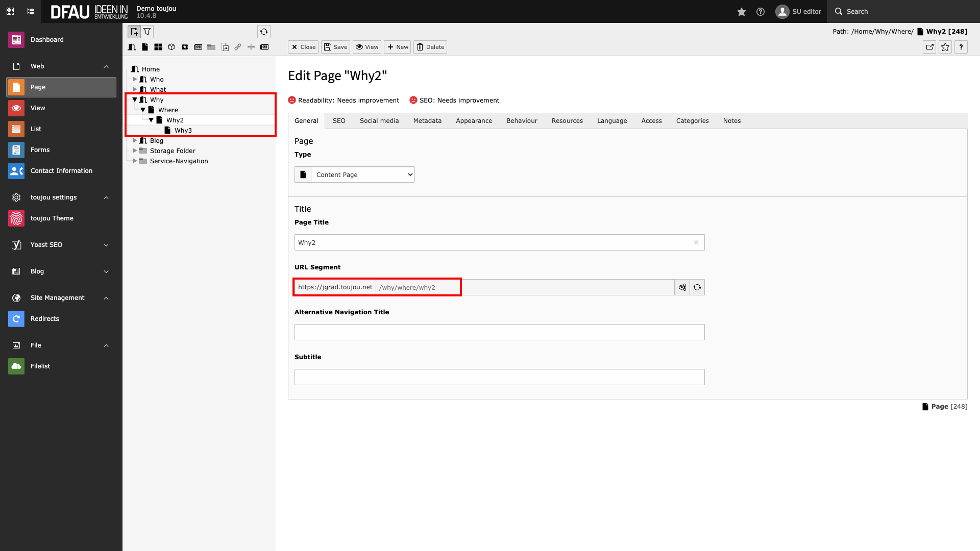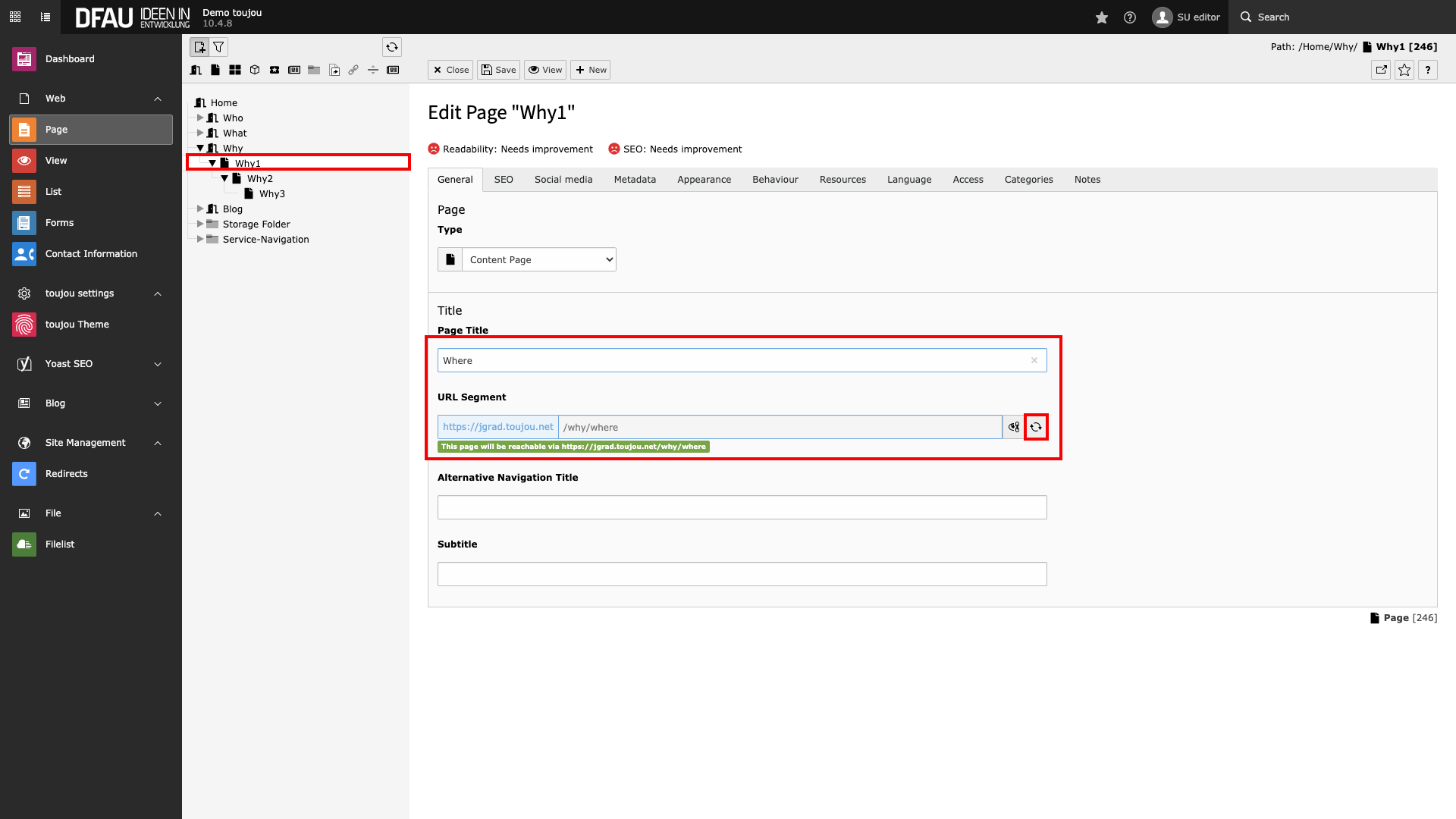 In the page properties of »Why1« we will change the page title from »Why1« to »Where«. By clicking the refresh button located at the far right to the URL segment the new path will be updated.