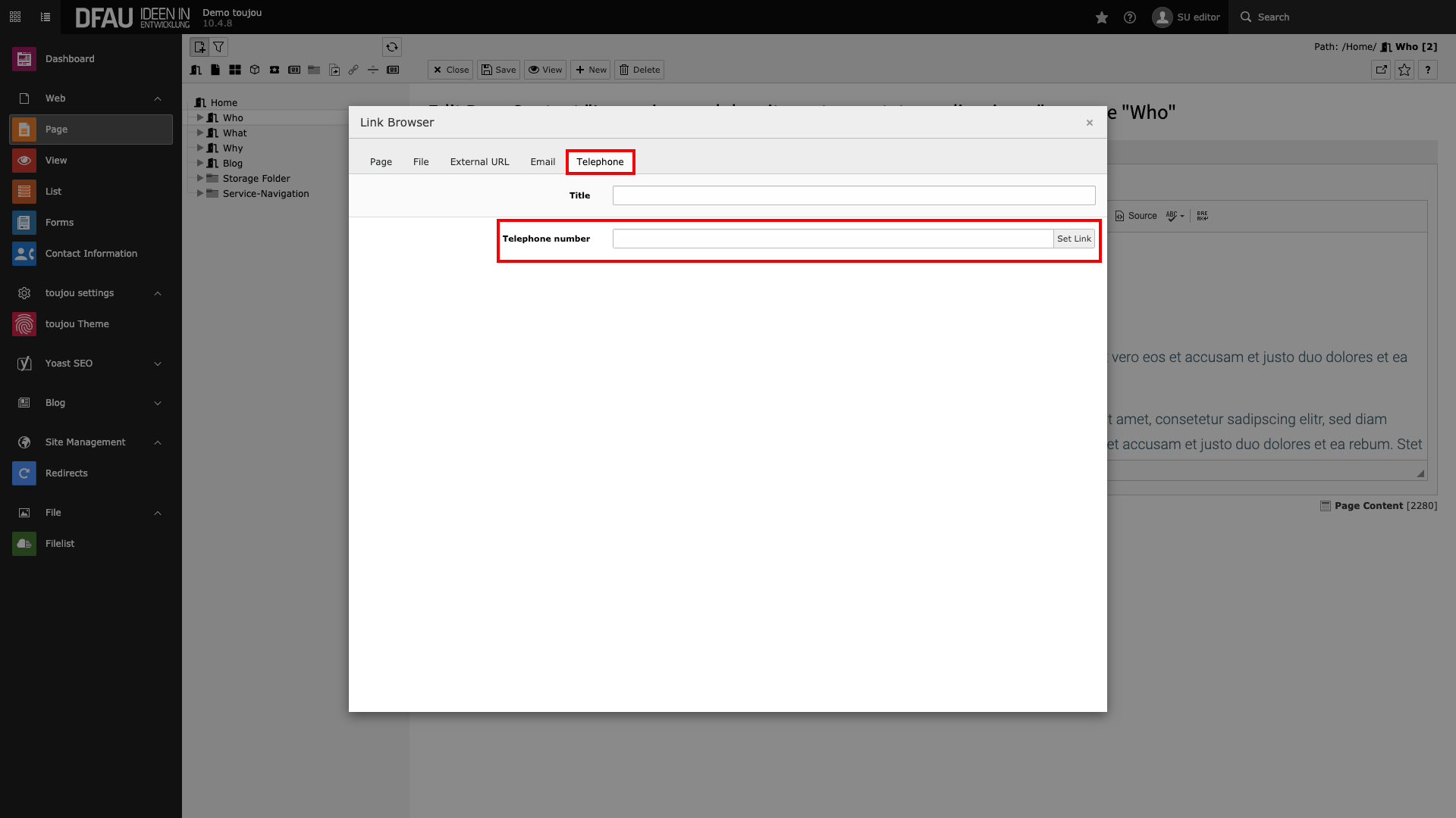 With this update, the ability to connect a telephone number has been simplified to be as easy as it is to connect pages, files and email. To generate a link in the front end to a telephone number, mark the respective text number in the rich editor text and click on the link button. The link browser will open as a new pop-up window (see screenshot). Enter the number in the phone number field in the Telephone tab which is at the far right. Please note notice: A valid phone number consists only of numbers and the character »+«.