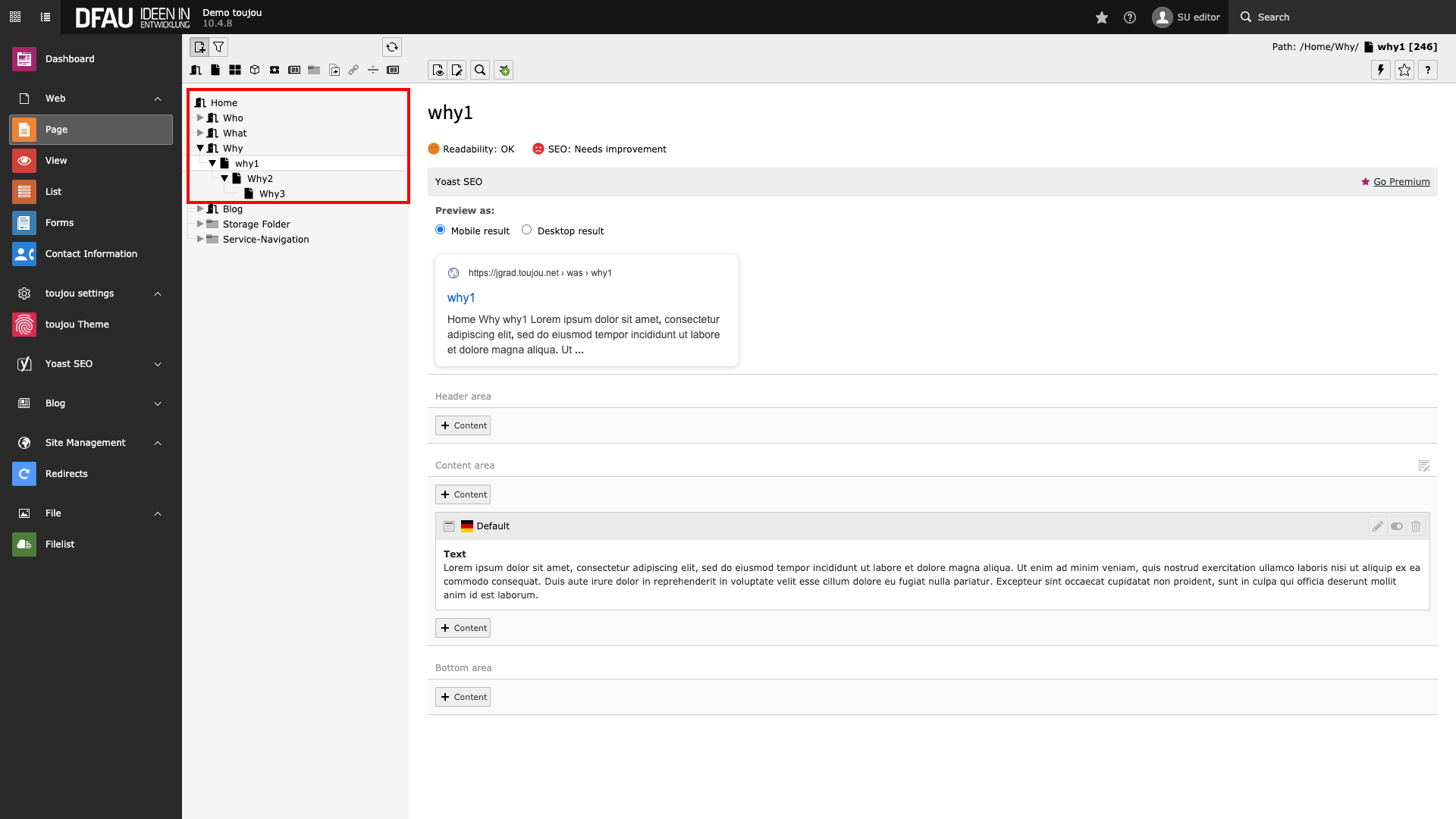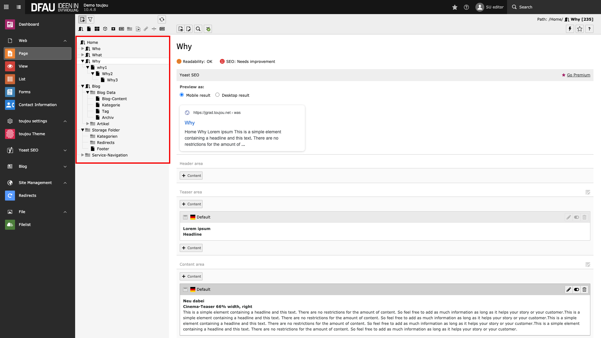 Along with these changes, TYPO3 has also included the latest technical adaptations to address data and privacy concerns (SameSite cookies), new PHP packages and a cache optimization that increases a pages’ loading speed. We have compiled a list of relevant changes for toujou customers and TYPO3 editors. For further information to the steps, click through our detailed TYPO3 and toujou tutorials.