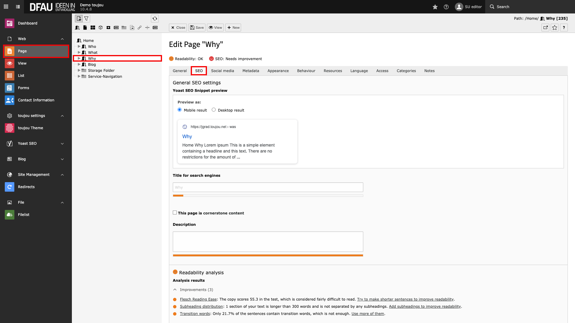 As you know the the »change frequency« and »priority« settings of a page are very important for search engine crawlers. Now they can be modified manually for both individual pages and the sitemap. Both of these functions have been added to the SEO tab but should only be edited by experienced SEO editors.