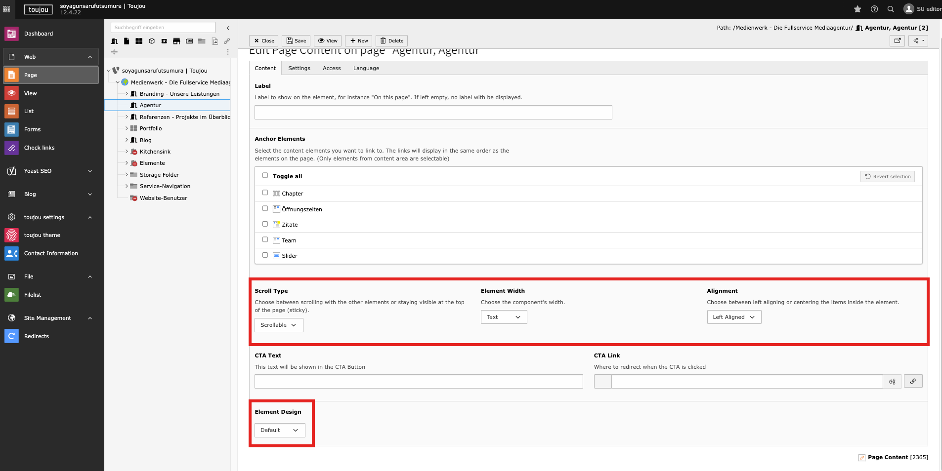 - With the Element Width you can choose the orientation of the inpage navigation to either the content width or to the page width.