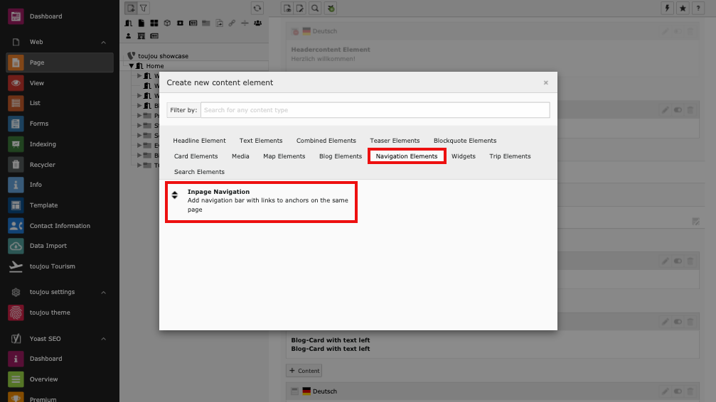 - After clicking +Content, select Inpage Navigation located in the Navigation Elements tab.