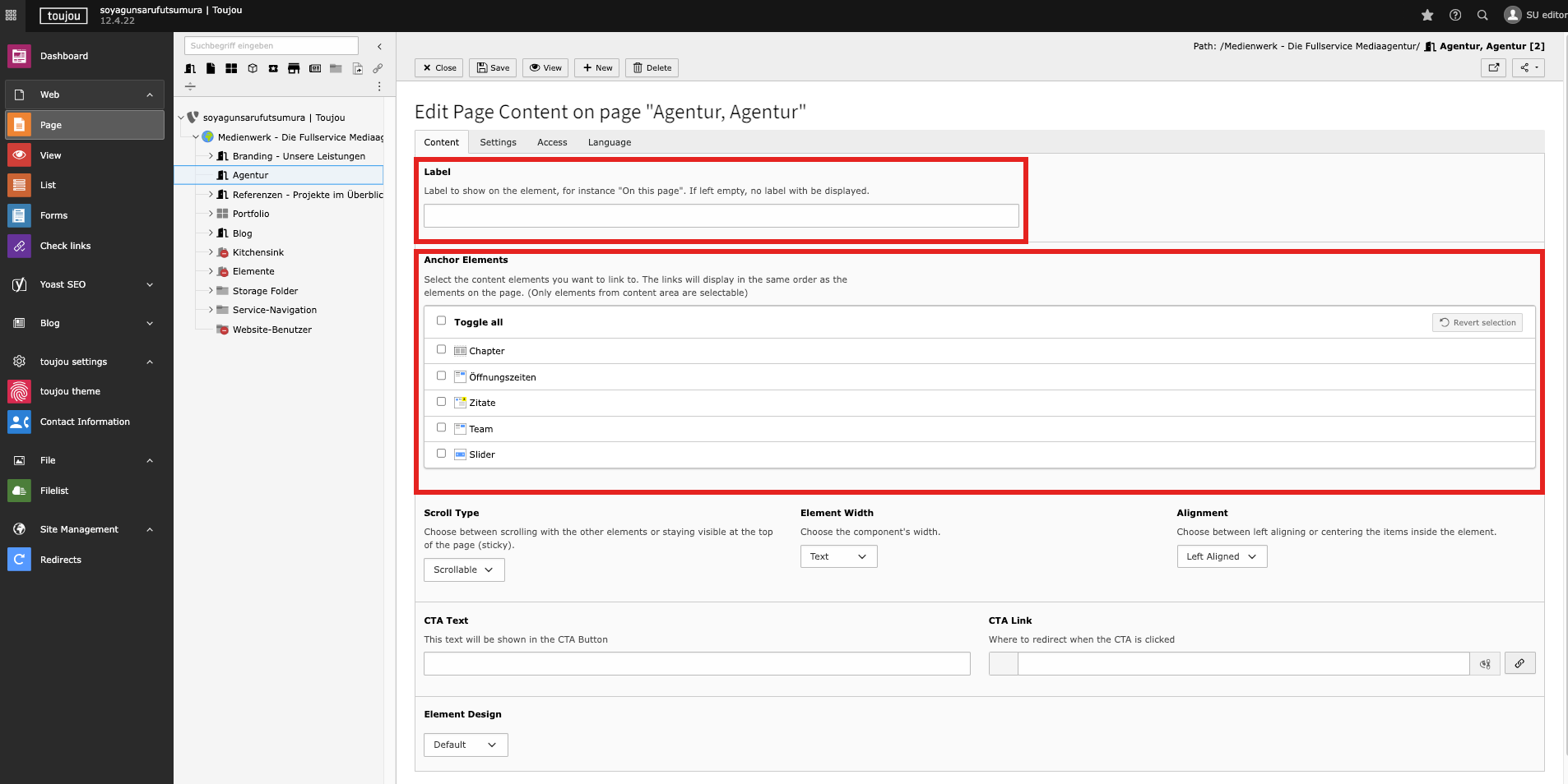Worth noting: Content hidden in the Backend ('deactivated') will be displayed in the Anchor Elements among the available objects and can still be selected. As soon as the respective element is enabled, it will appear in the inpage navigation in the Frontend.