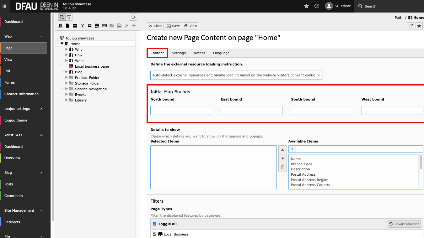 - To define a map section that will be displayed when the page is loaded for the first time you have to enter the coordinates in the Initial Map Bounds area within the Content tab.