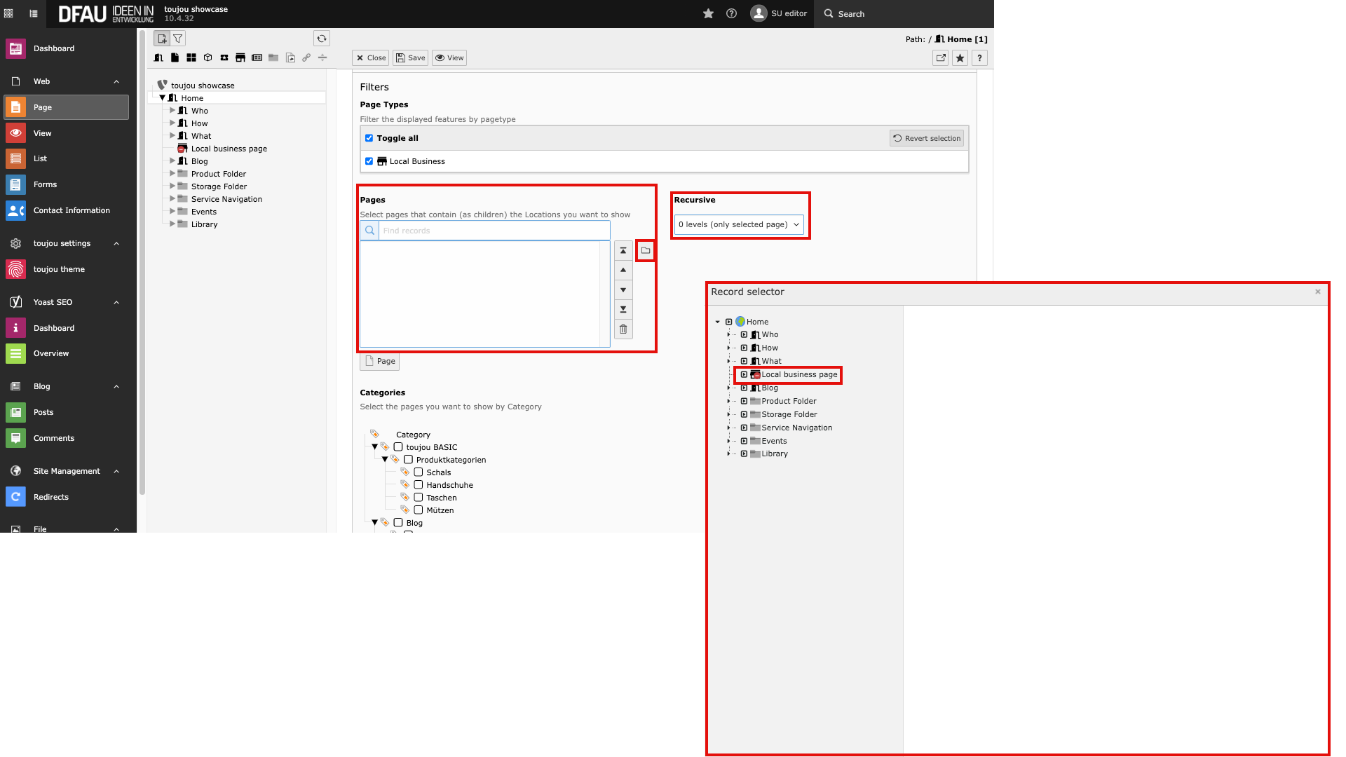 - Then select the relevant page(s) by clicking on them individually. All local business pages listed in the page tree of the hierarchy level below will be captured immediately.