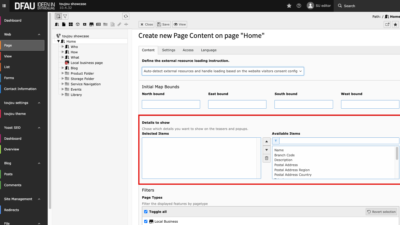In order for the locations to be displayed in the location finder, please make sure that the controller for »Page visible« and »Page enabled in menu« are switched to green in the respective page properties of the local business page in the Access tab.