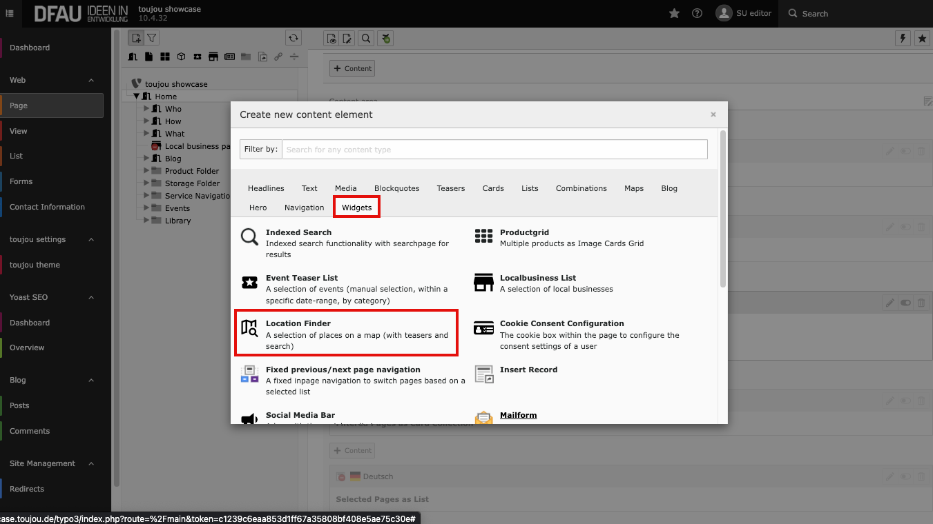 - After clicking +Content in the content area of your page, the element wizard will appear automatically. Click on the Widgets tab and then select the Location finder.