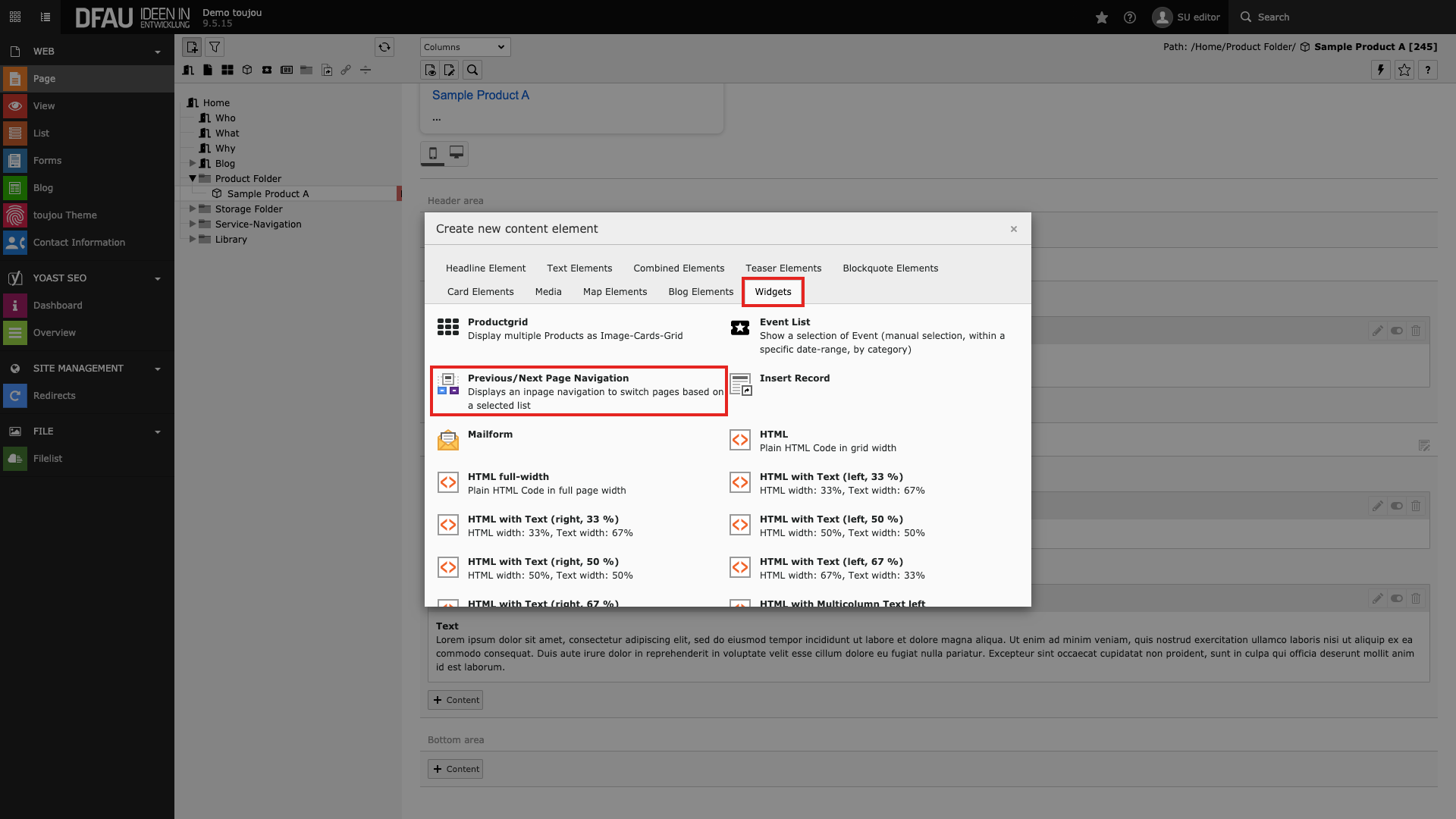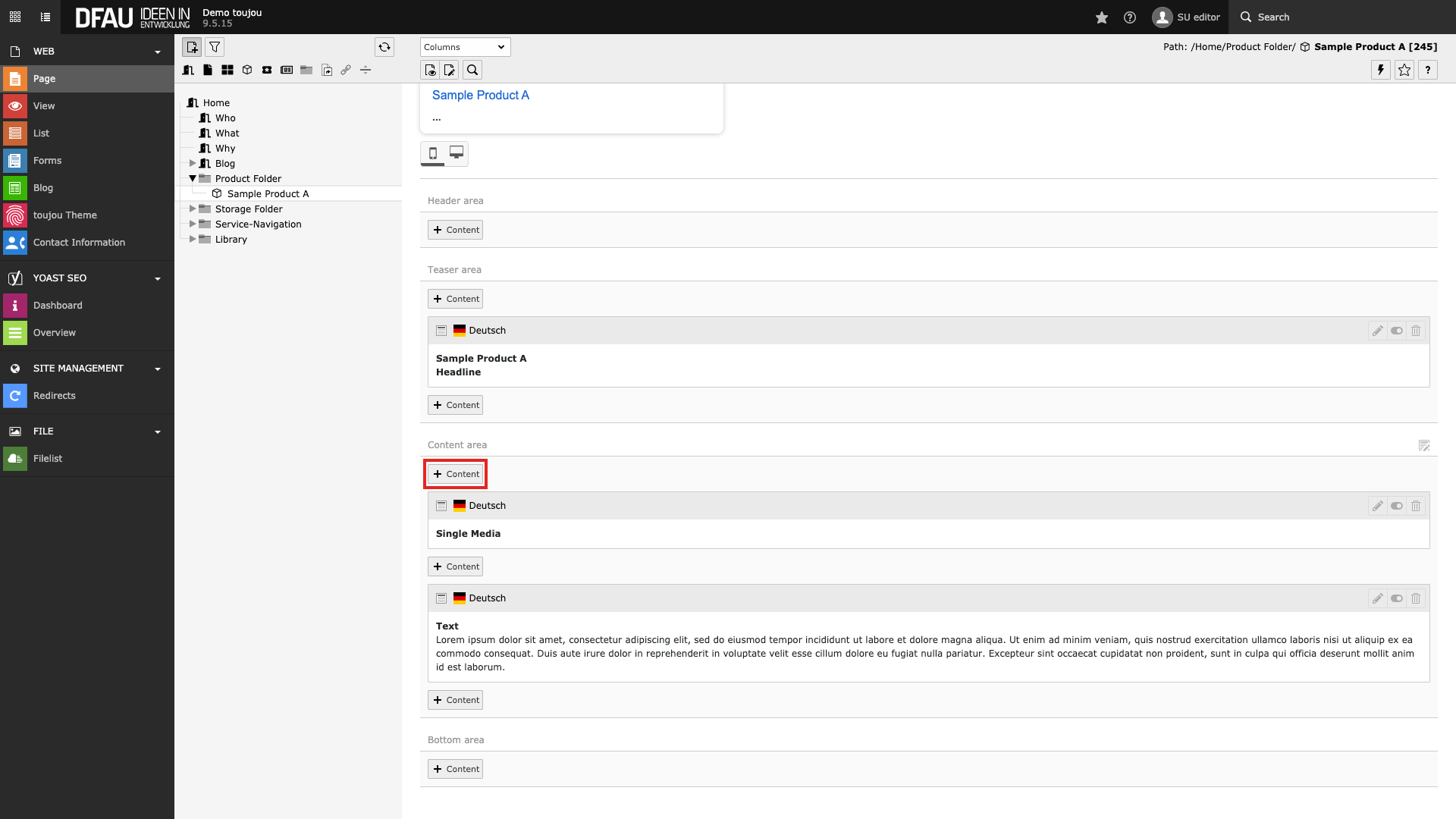 - It does not matter where you place the content element on the respective page.