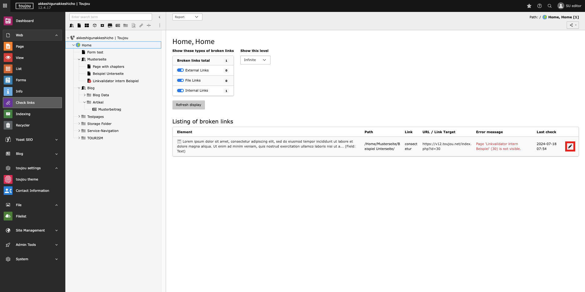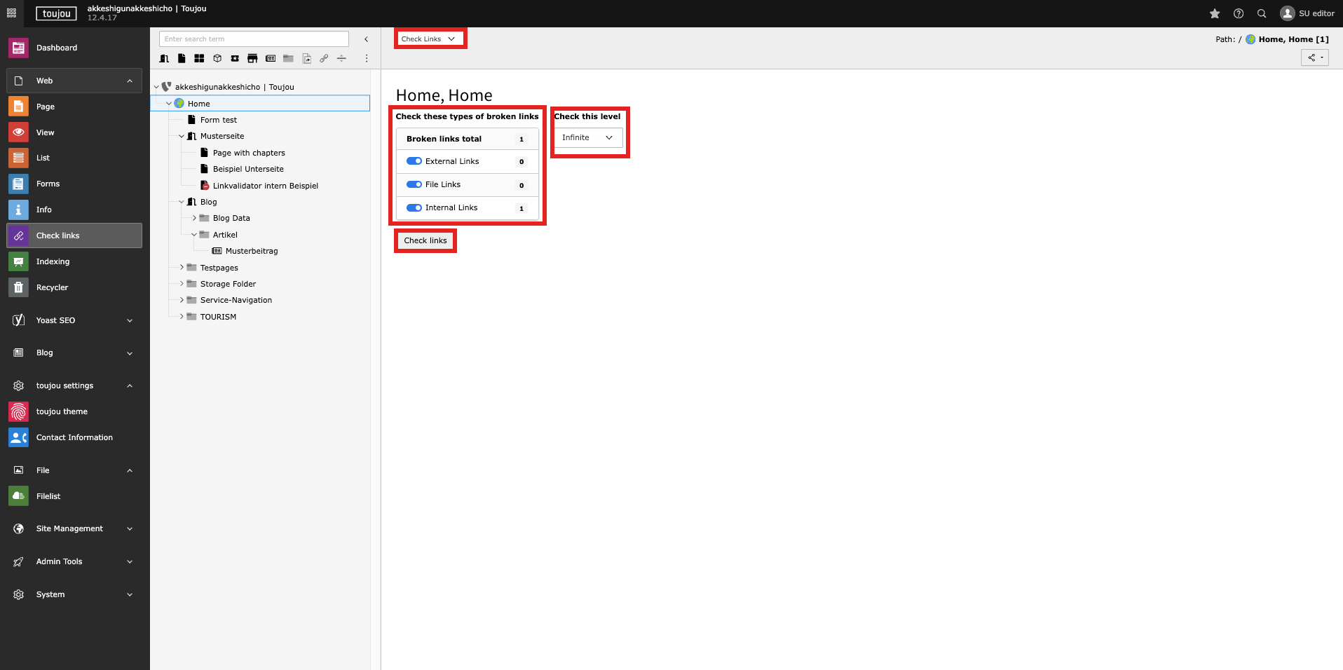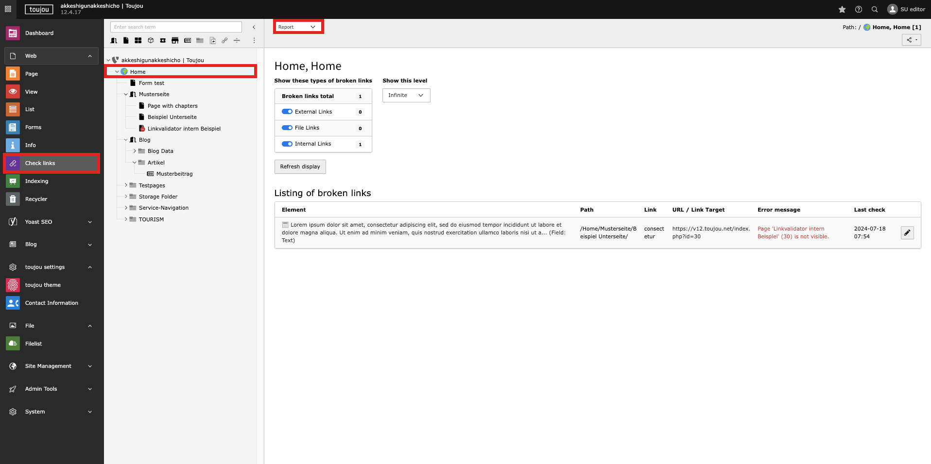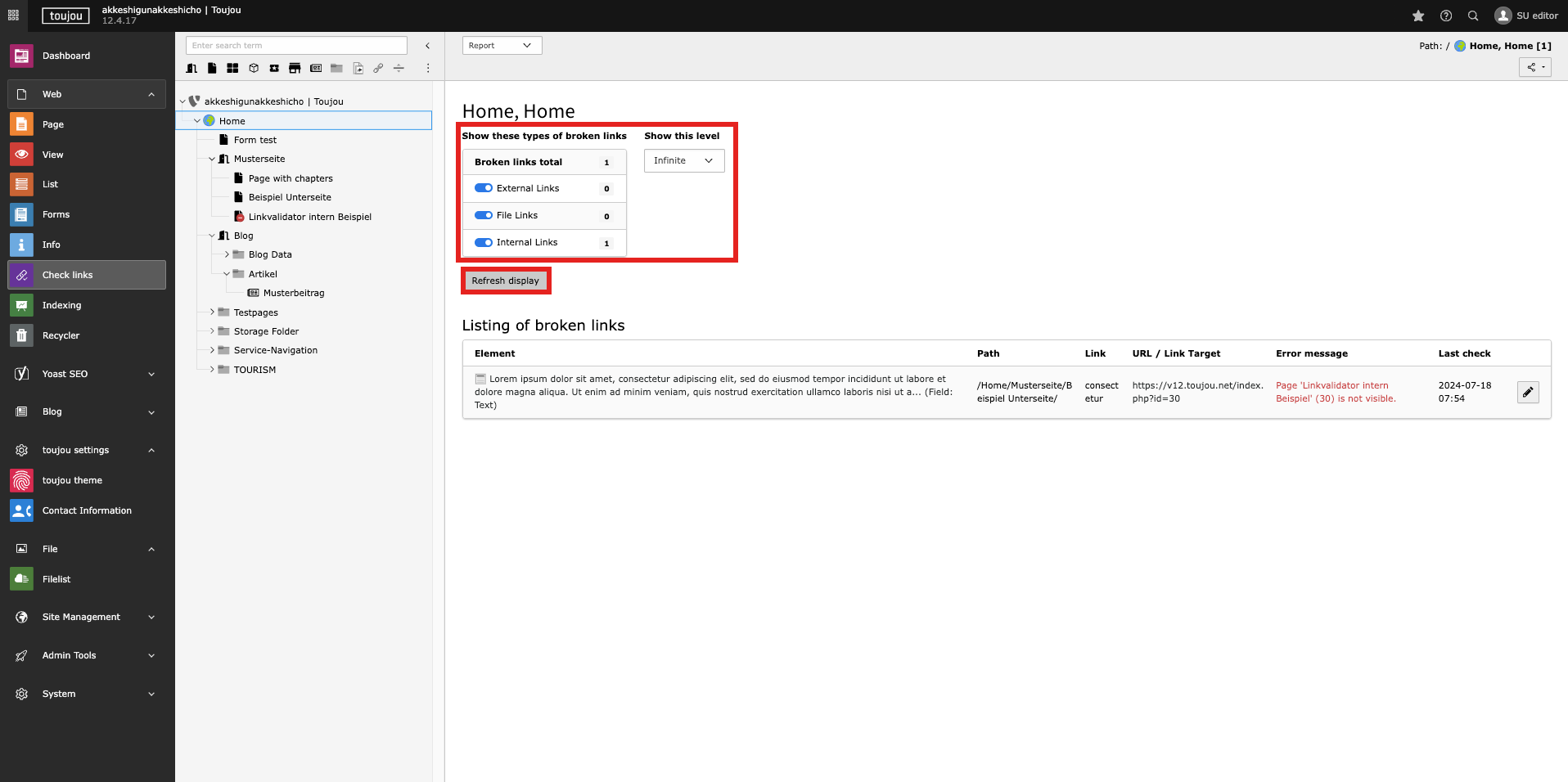 - Use the dropdown menu under Check this level to set the amount of levels that should be considered in the page tree, starting from the selected page. To display broken links for all pages, choose the “infinite” level option in the dropdown menu (and select the Home as referring page).