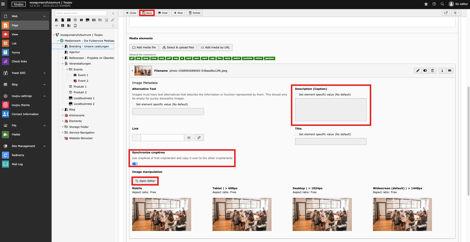 - If the slider in the Synchronize cropArea area is activated (blue), the image crops from the first (mobile) image section are automatically applied to all end devices. If you want to deactivate this setting, click on the slider.