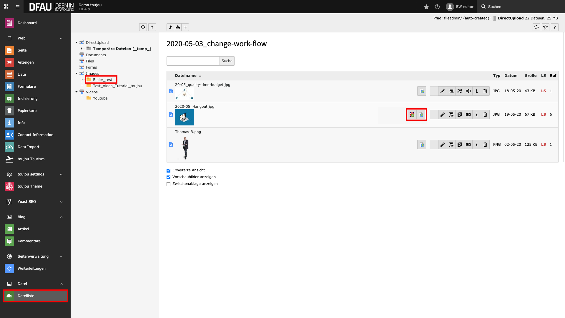 If the globe symbol in the file list doesn't appear, check for the »extended view« of the elements. For this purpose the field "Extended view" must be marked with a tick.